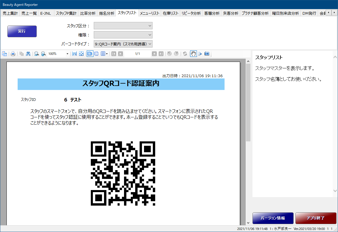 スタッフログインバーコードの案内ページ印刷。 この画面を読み込ませたページが、スタッフのログイン認証ページとなります。