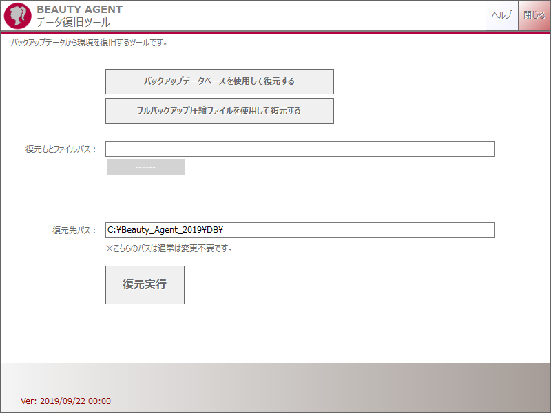 | ▶復元実行 | バックアップから復元を実行します。 ※他のアプリは全て終了した状態で実行してください。 |