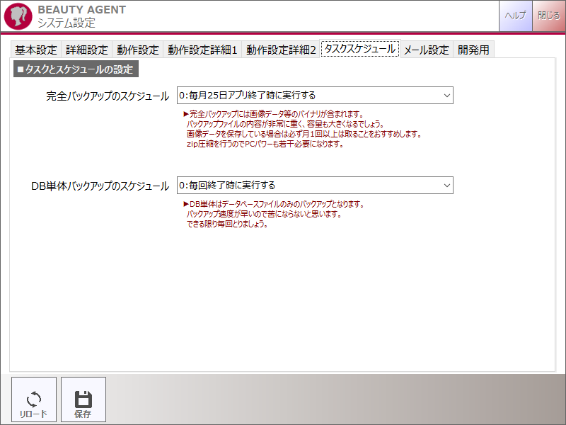Ver 2019/09/15 以降のバージョンから、毎月25日終了時にフルバックアップを取るというオプションが標準設定となりました。 毎月25日はアプリ終了時にデータベース、画像ファイル一式をzip圧縮してバックアップします。圧縮を行うので多少時間を要します。 こちらのフルバックアップ圧縮ファイルを使用すれば、画像ファイルも含めて完全に復元することが出来ます。 PC環境が壊れて、再インストールした場合は、こちらの方法で復元することをおすすめします。 ※バックアップタイミングは「システム設定⇒タスクスケジュール」で変更できます。 (下図参照) |