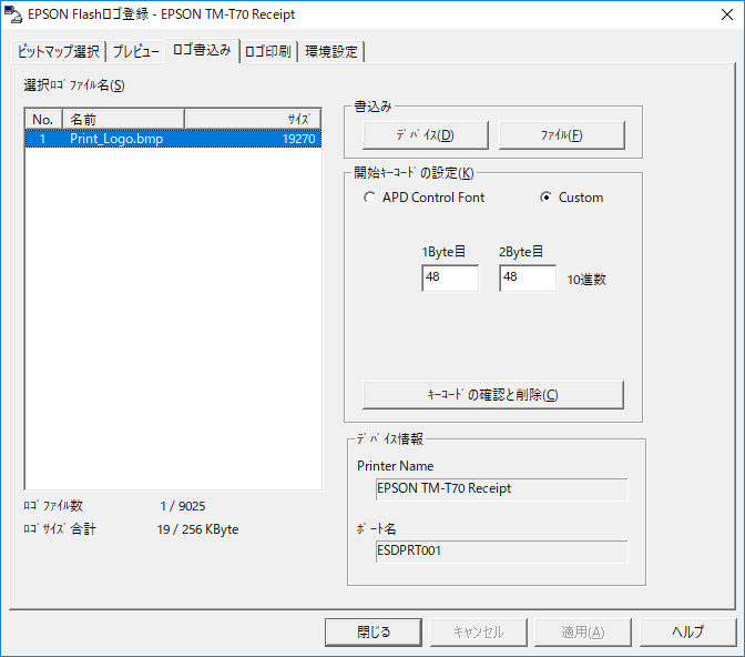 ③ロゴ書き込み>「デバイス」をクリック(この操作で実際に書き込む) ※事前に開始キーコードを「custom」を選択し、下図のように48、48と設定する。